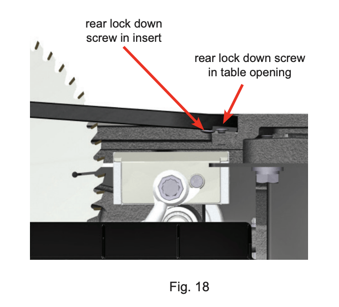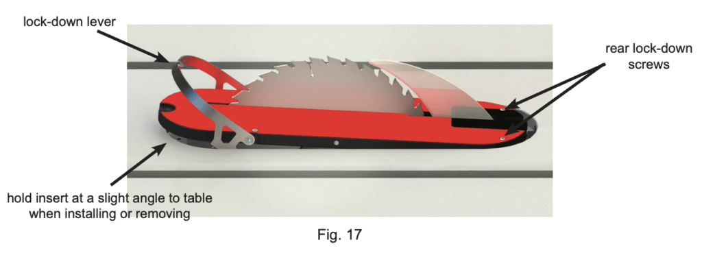To install the table insert, hold it at a slight angle, with the lock down lever rotated upward and the rear of the insert lower than the front. Slide the rear of the insert around the spreader or riving knife and against the back of the table opening so that the heads of the rear lock-down screws in the bottom of the insert slide under the heads of the lock-down screws in the table opening (see Figs. 17 and 18)