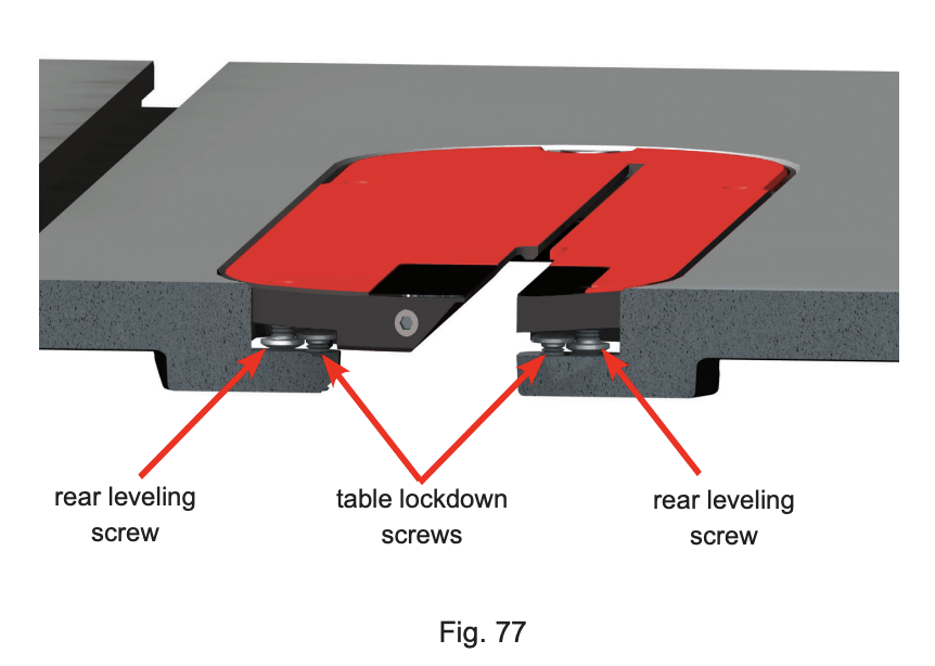 To set the height of the insert, use the included 3 mm hex L-wrench to adjust the front and rear leveling screws until the insert is just below the surface of the table. The lower end of each front leveling screw should rest on the corresponding support ledge on the table (see Fig. 76). When the lock-down lever is in the down and locked position, latching arms extend under each of the support ledges to prevent the insert from rising up.